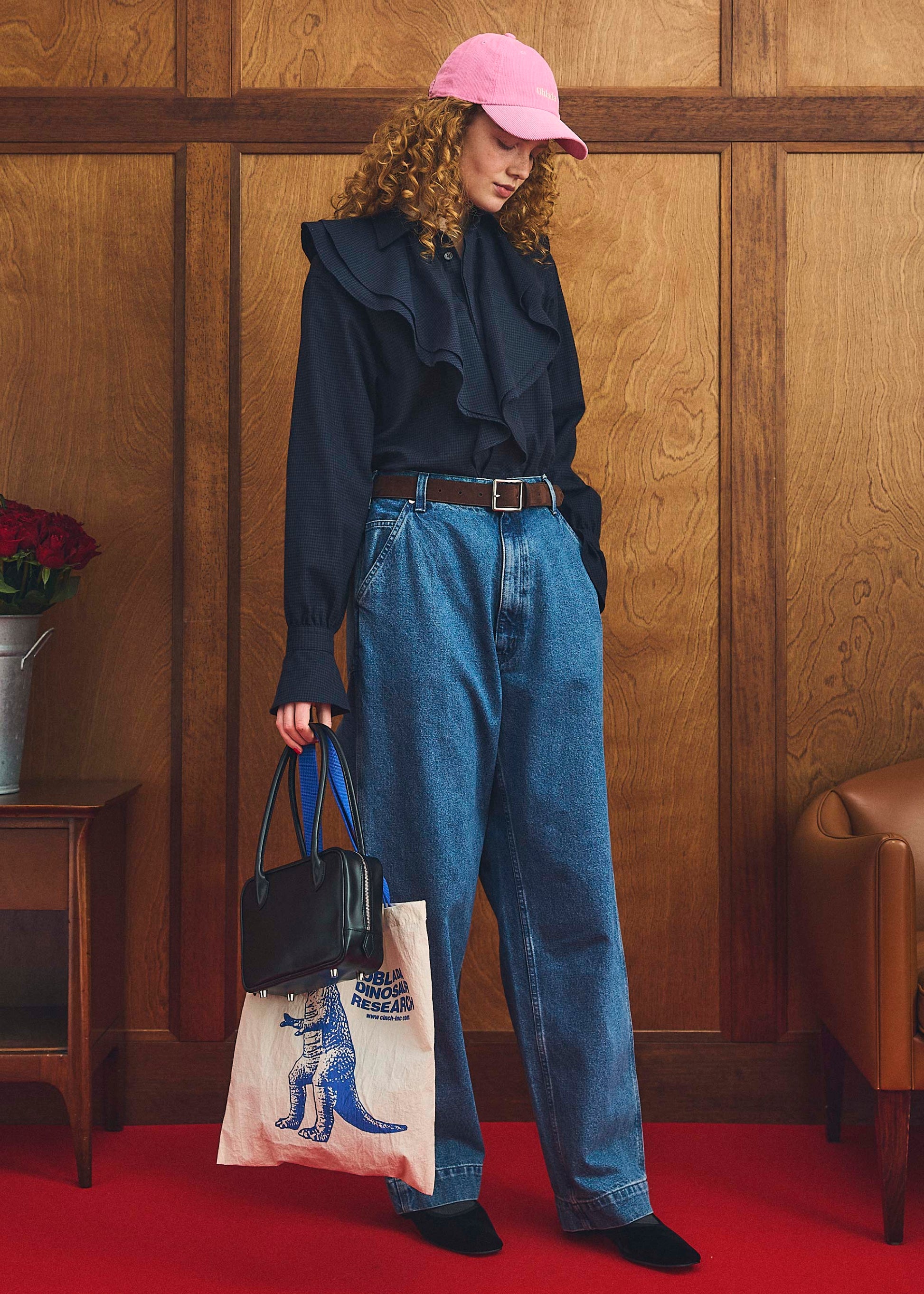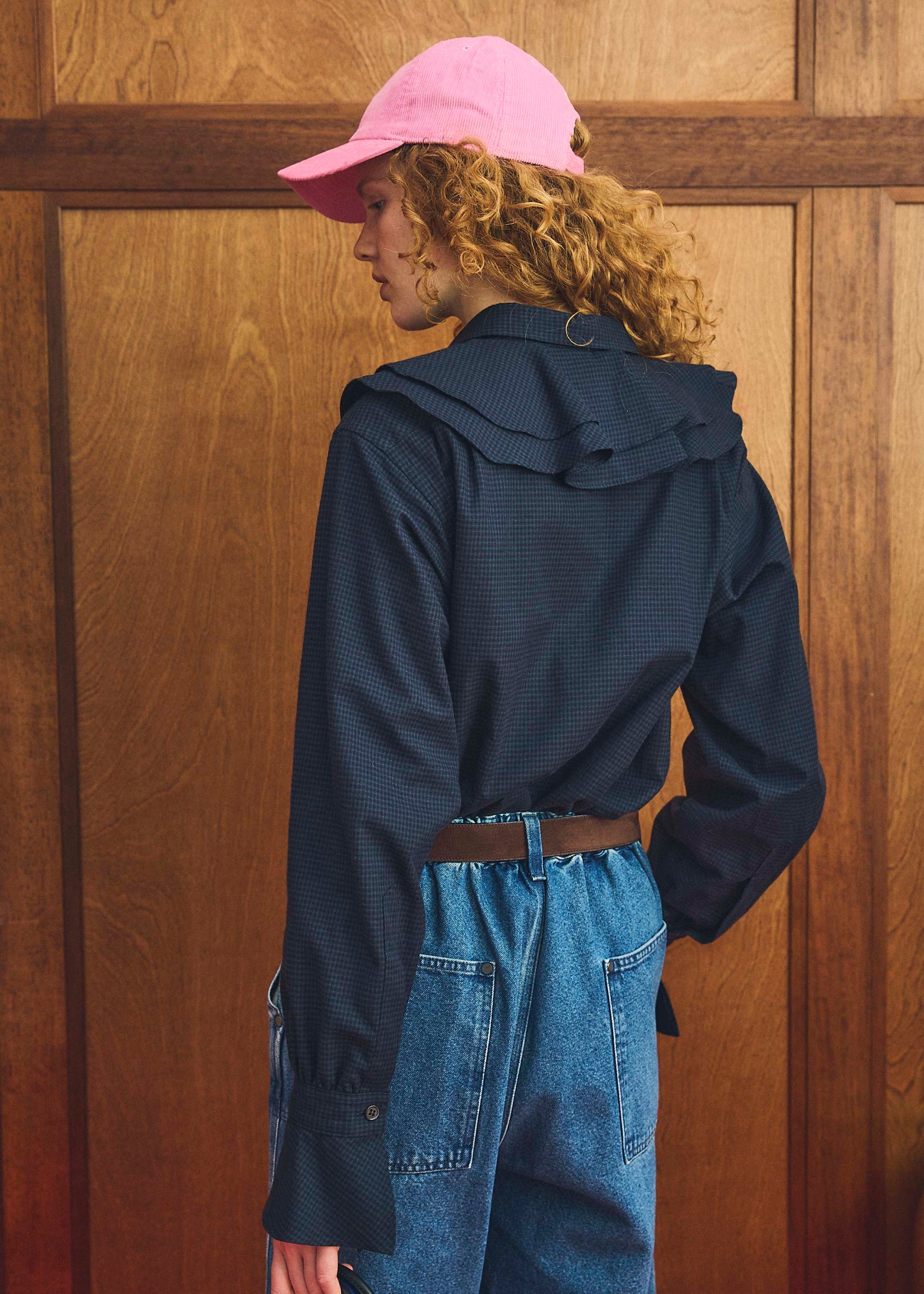 ラッフルディティールなのに、襟がワイドスプレッドなっているのがポイントになります。ブラックウォッチのようなブルーグリーンの細かいチェックで、ブリティッシュなムードが魅力です。