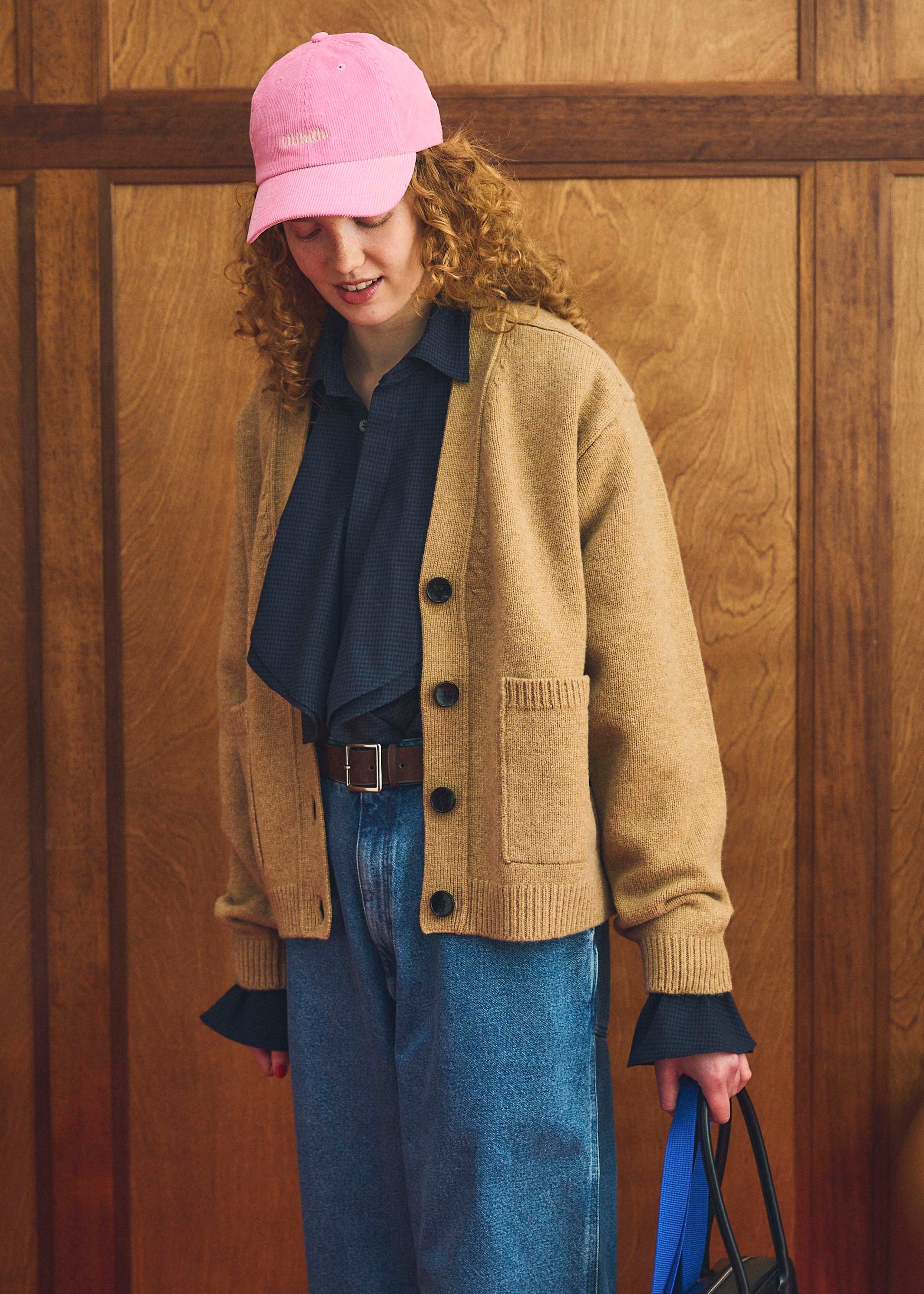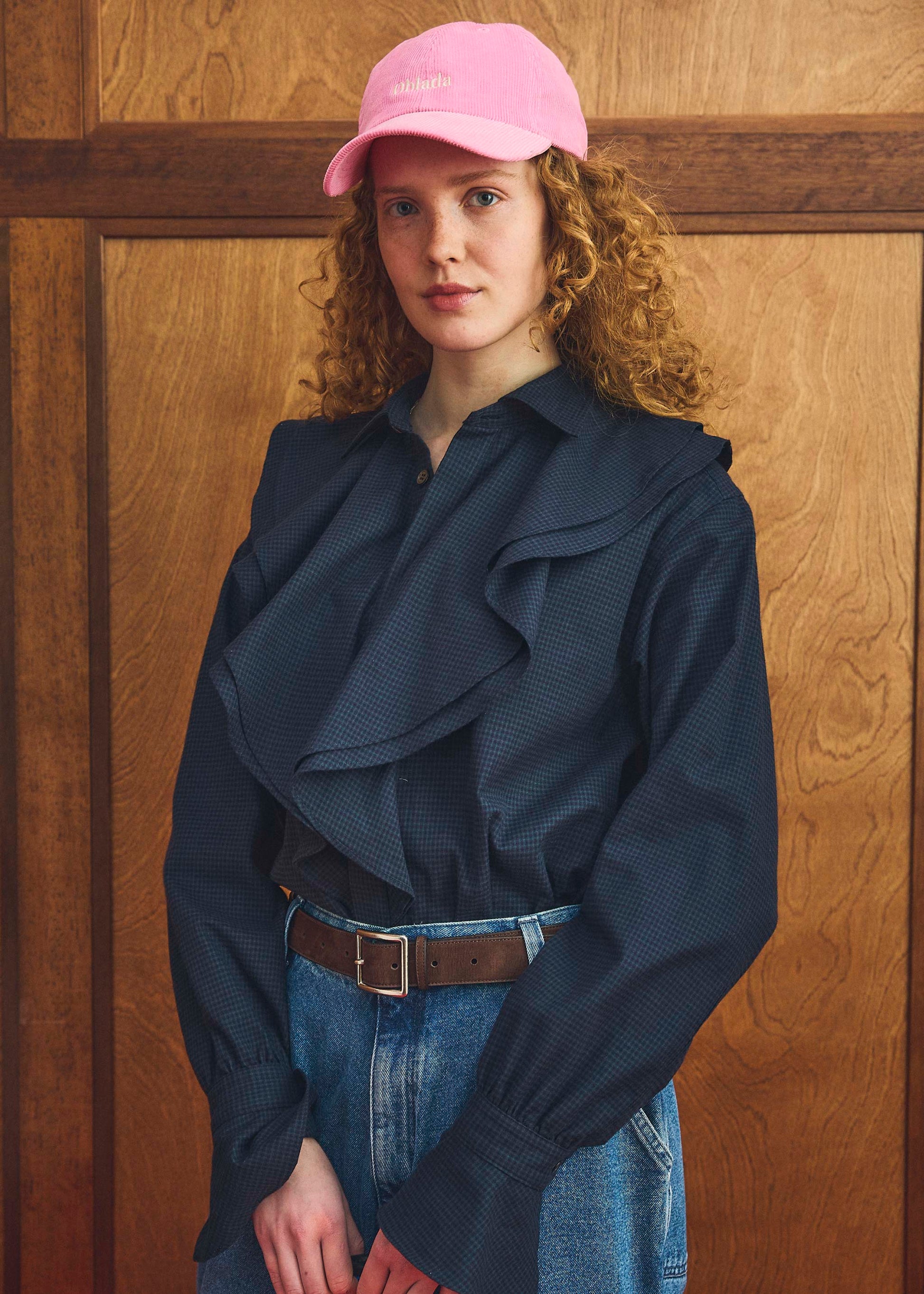 ライトピンクのコーデュロイのキャップと相性◎なブルーグリーンのチェックです!