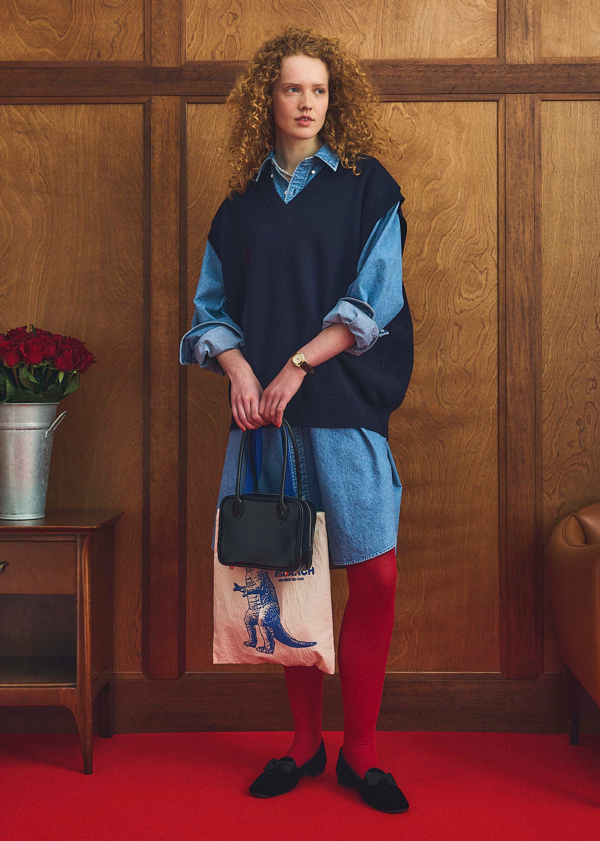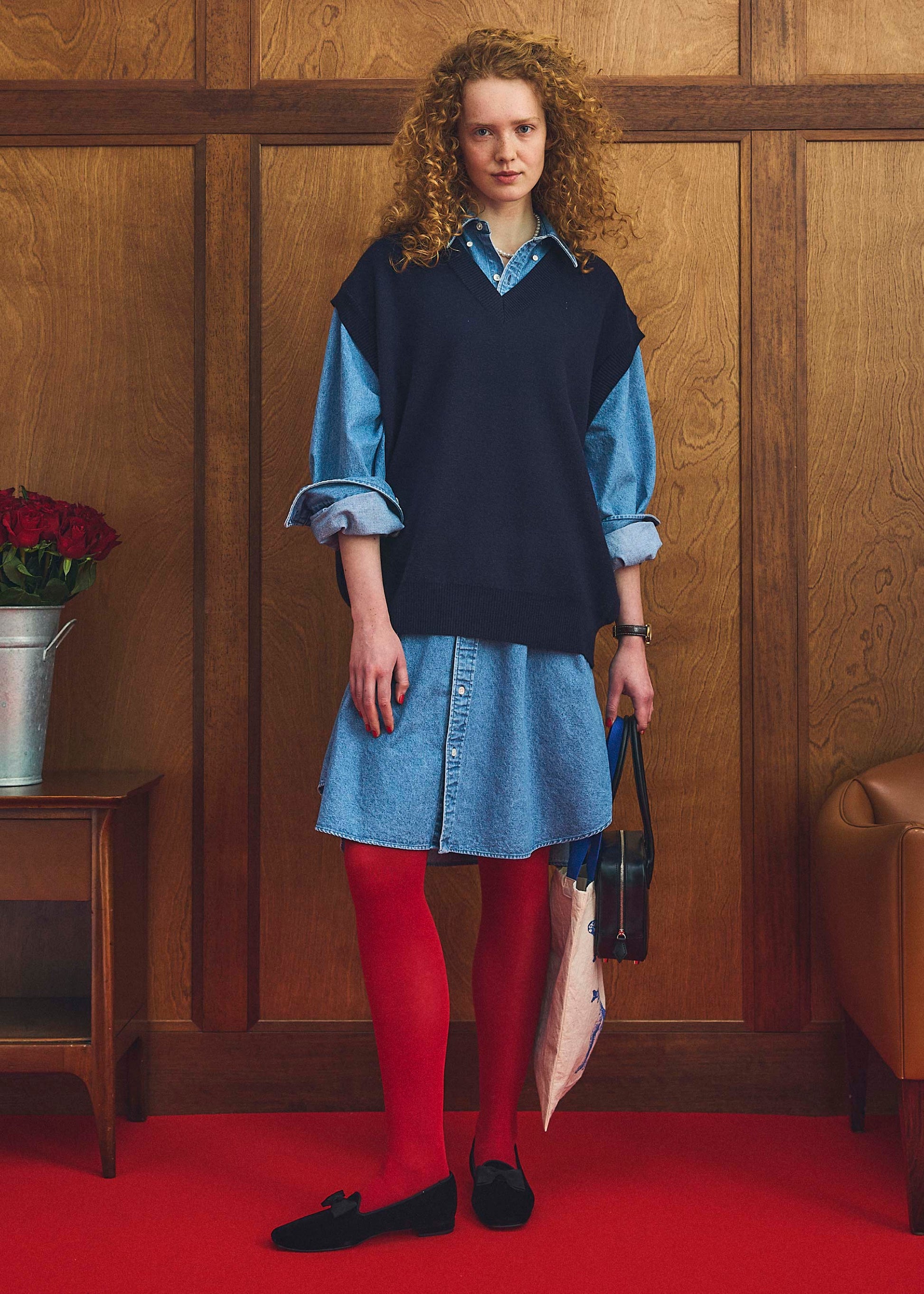 赤いタイツを合わせたりすると、スタイリングにスパイスを効かせることができます。