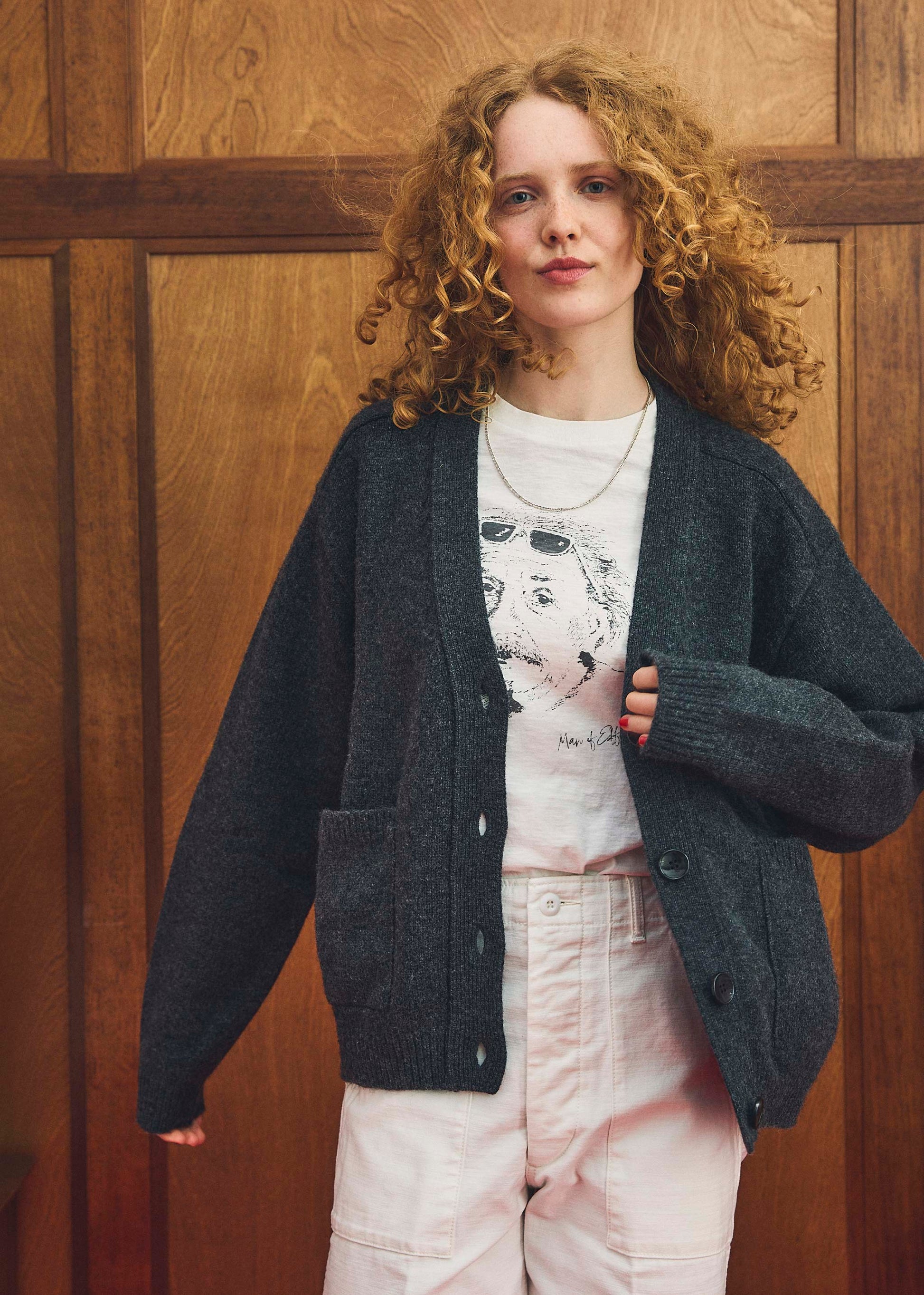 The design concept is "a men's-like cardigan with a length that is neither too long nor too short."