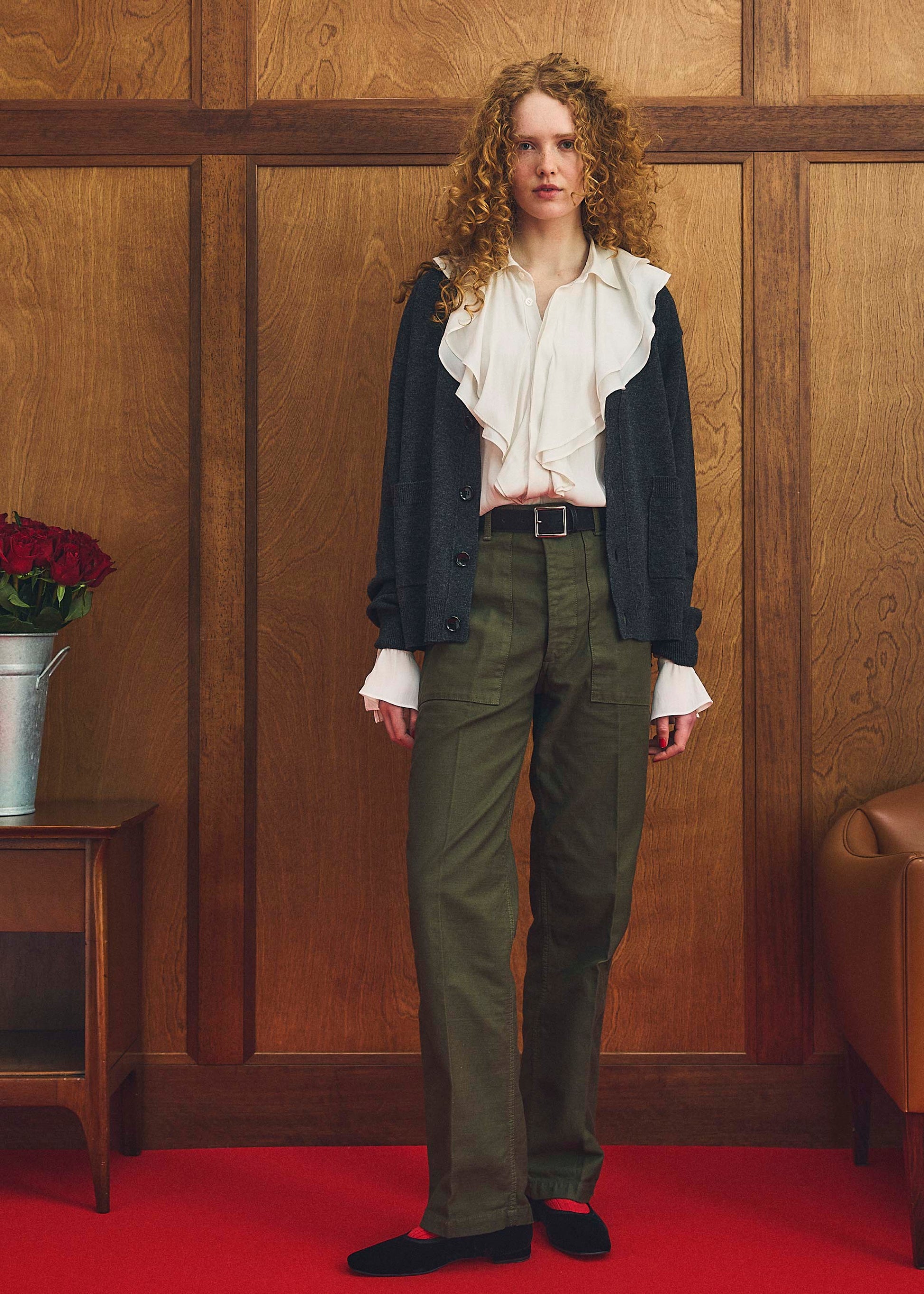 女性らしいトップスと相性が良いのが軍パンの良さ。