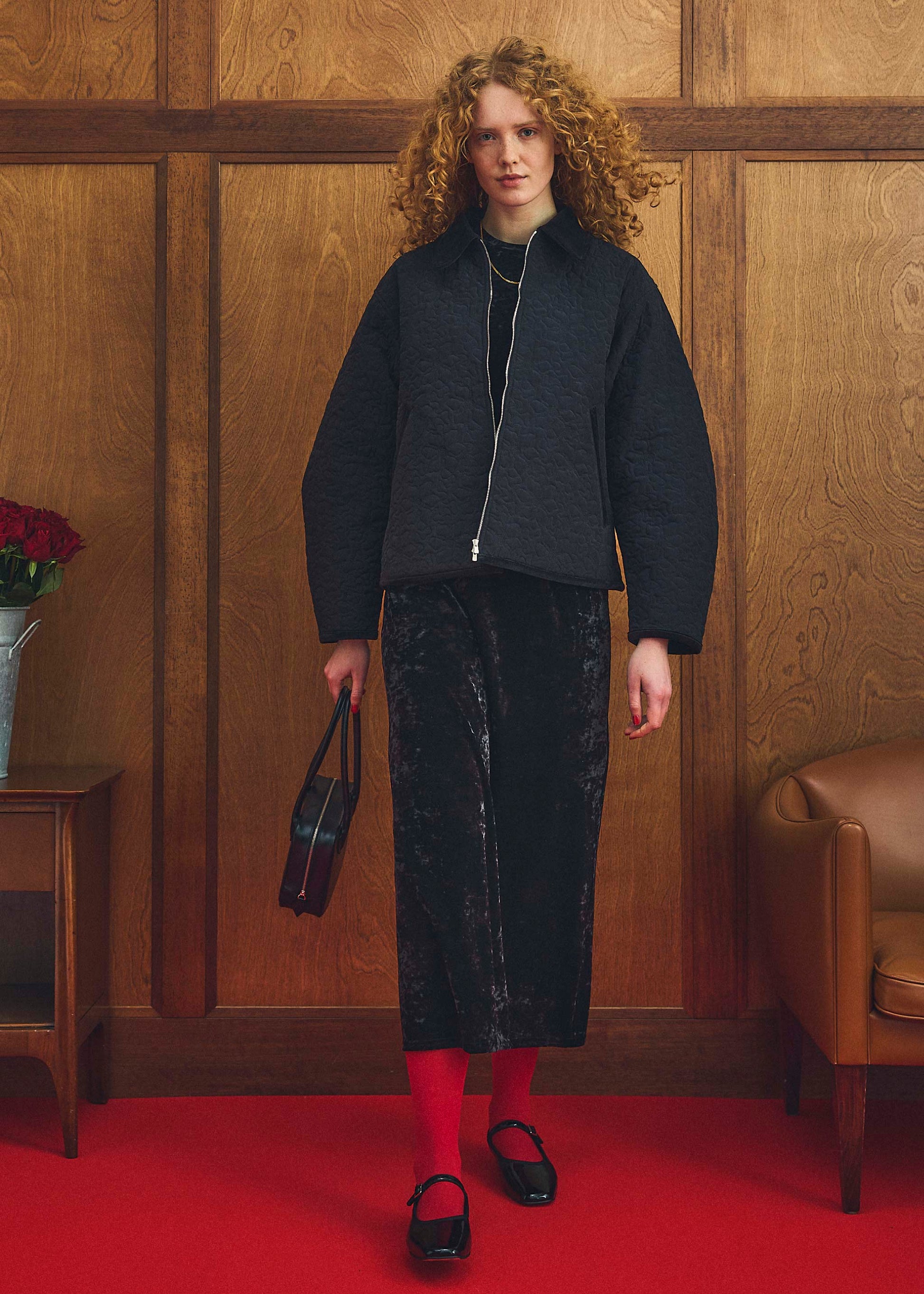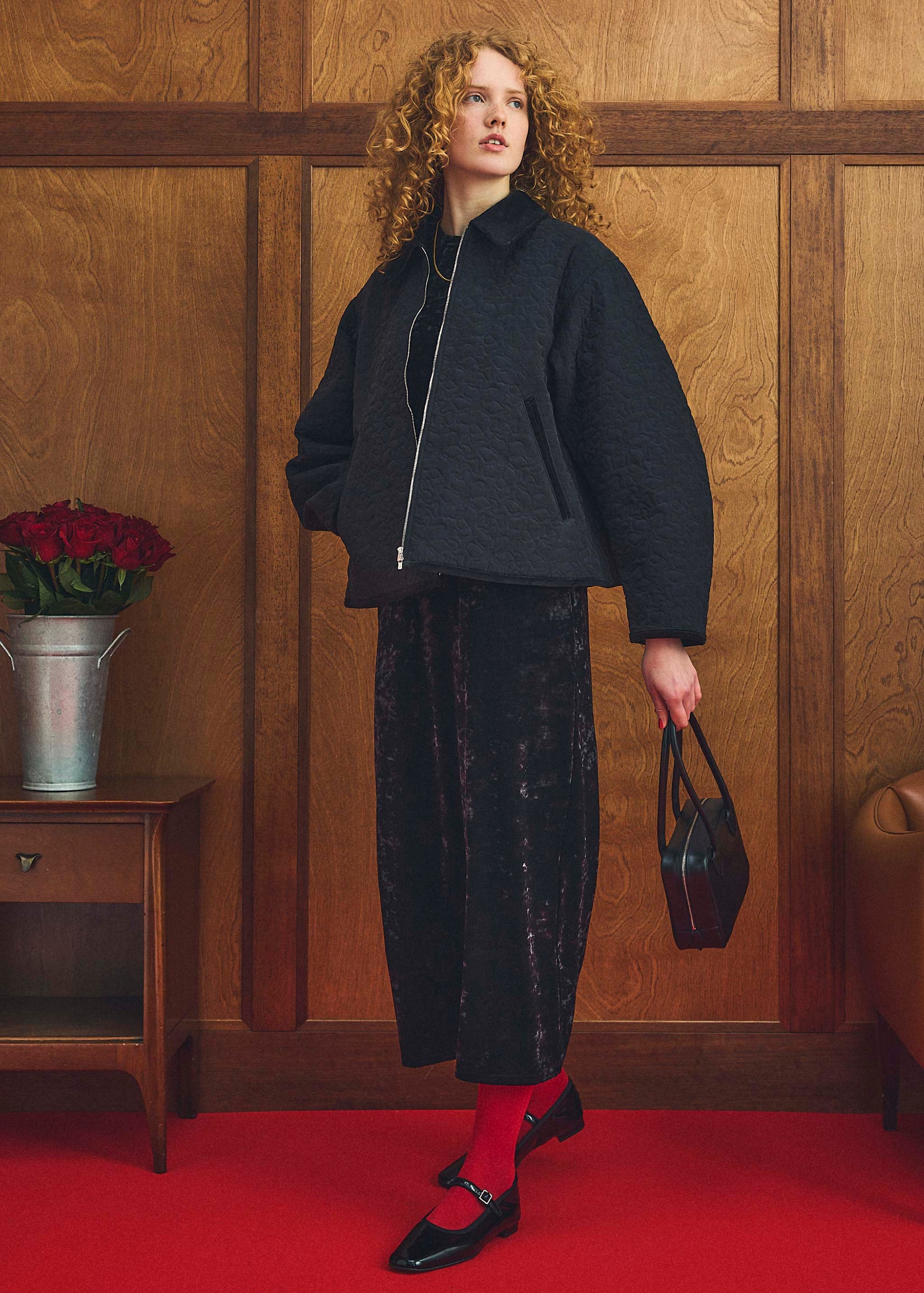 袖がカーブしているデザインで、着た時に袖にボリュームが出るシルエットが魅力です。ファスナーはエクセラファスナーを使用し、上品な煌めきがアクセントになっています。