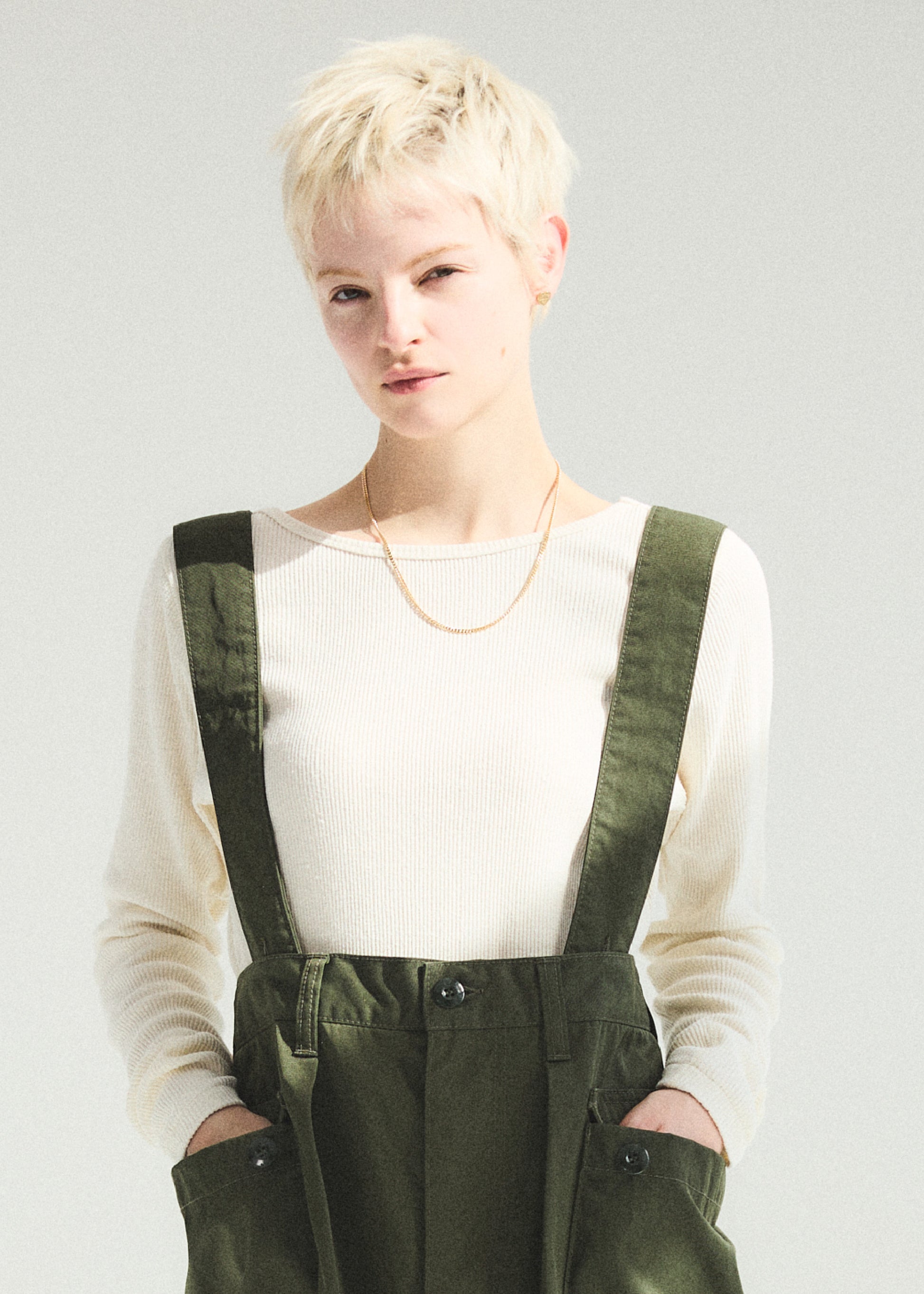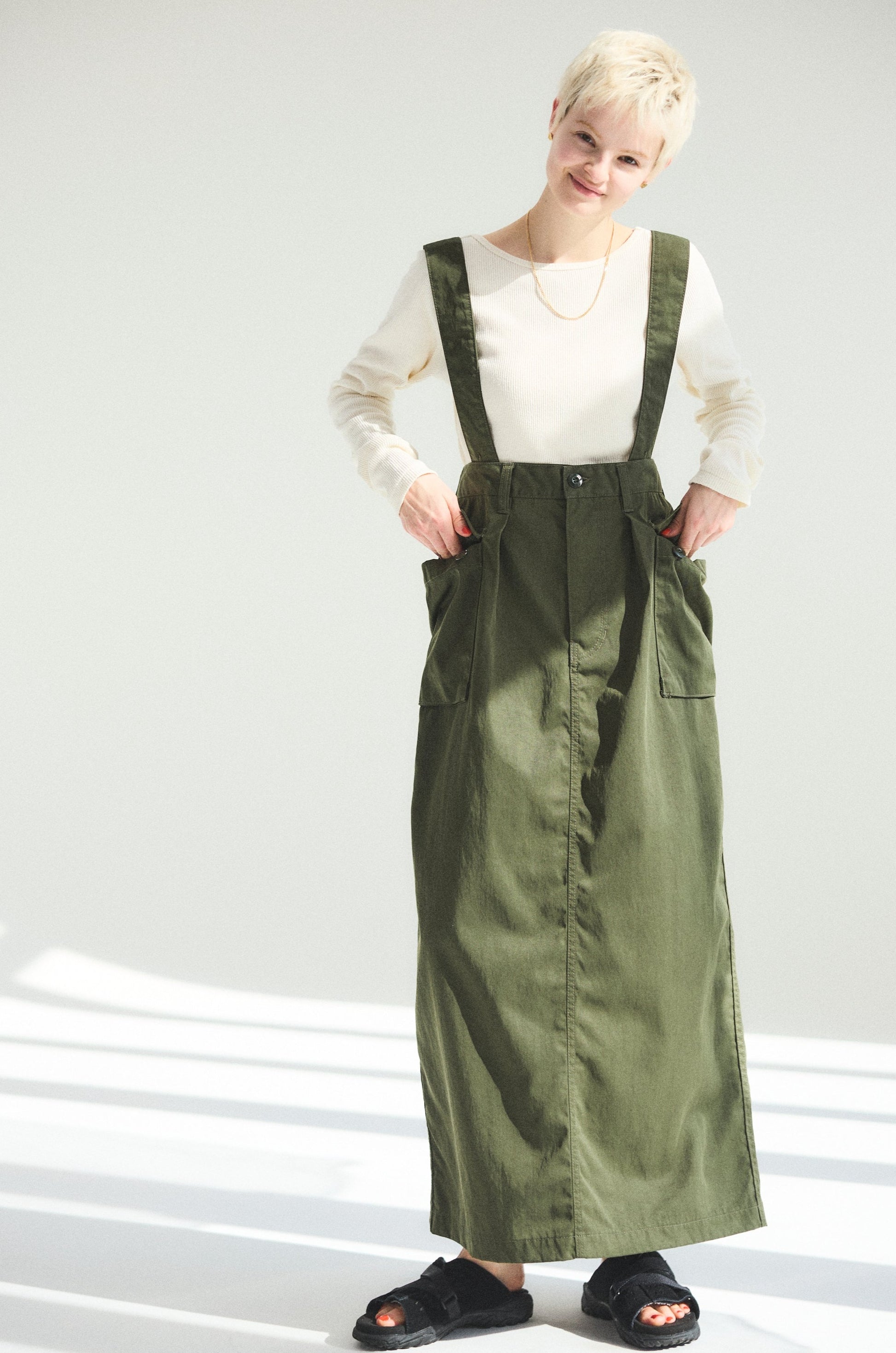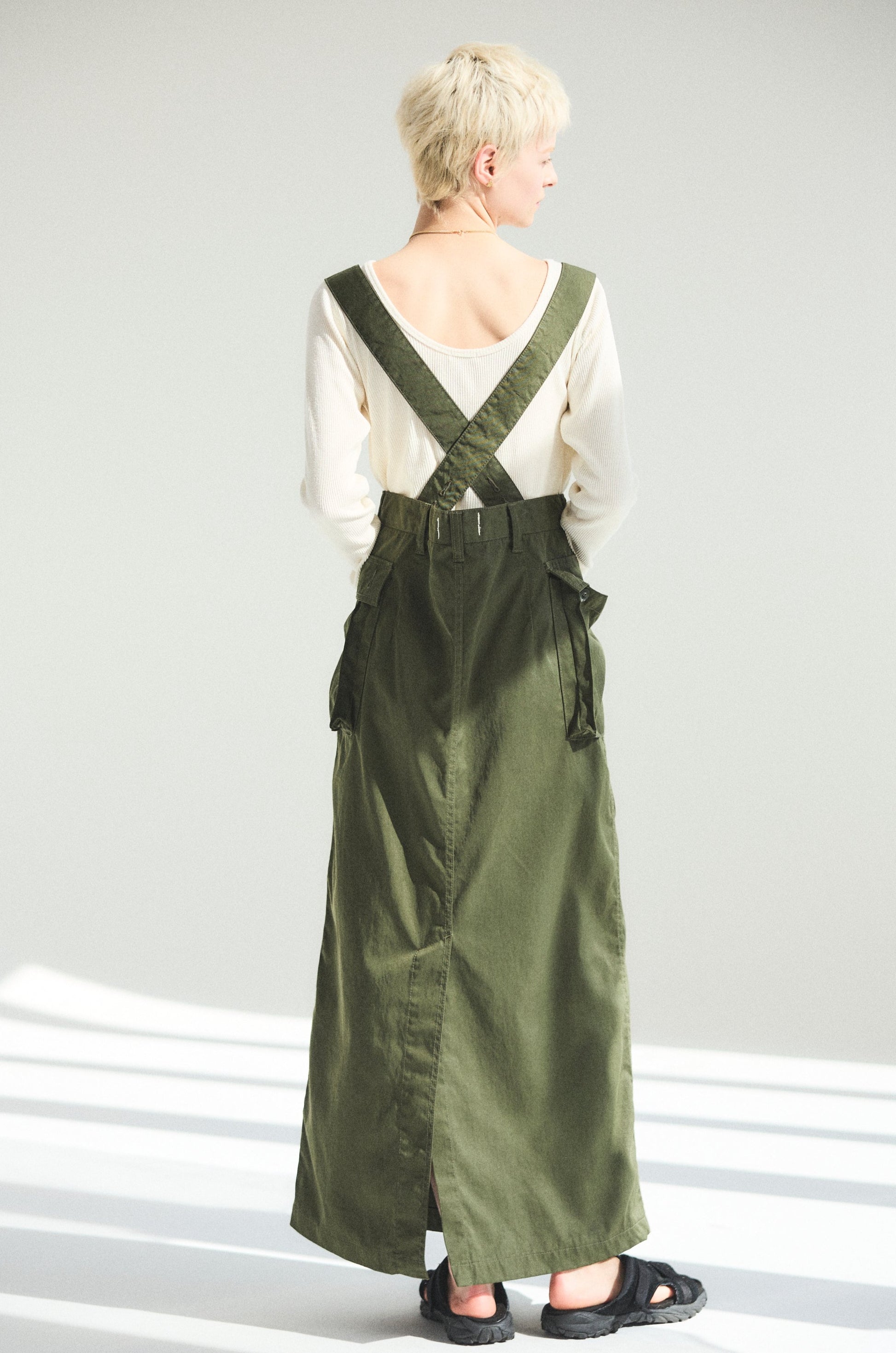 バッグサイドの空きが少し大きくて、デニムやミリタリーアイテムのボトムを女性らしく着るときに重宝します。
