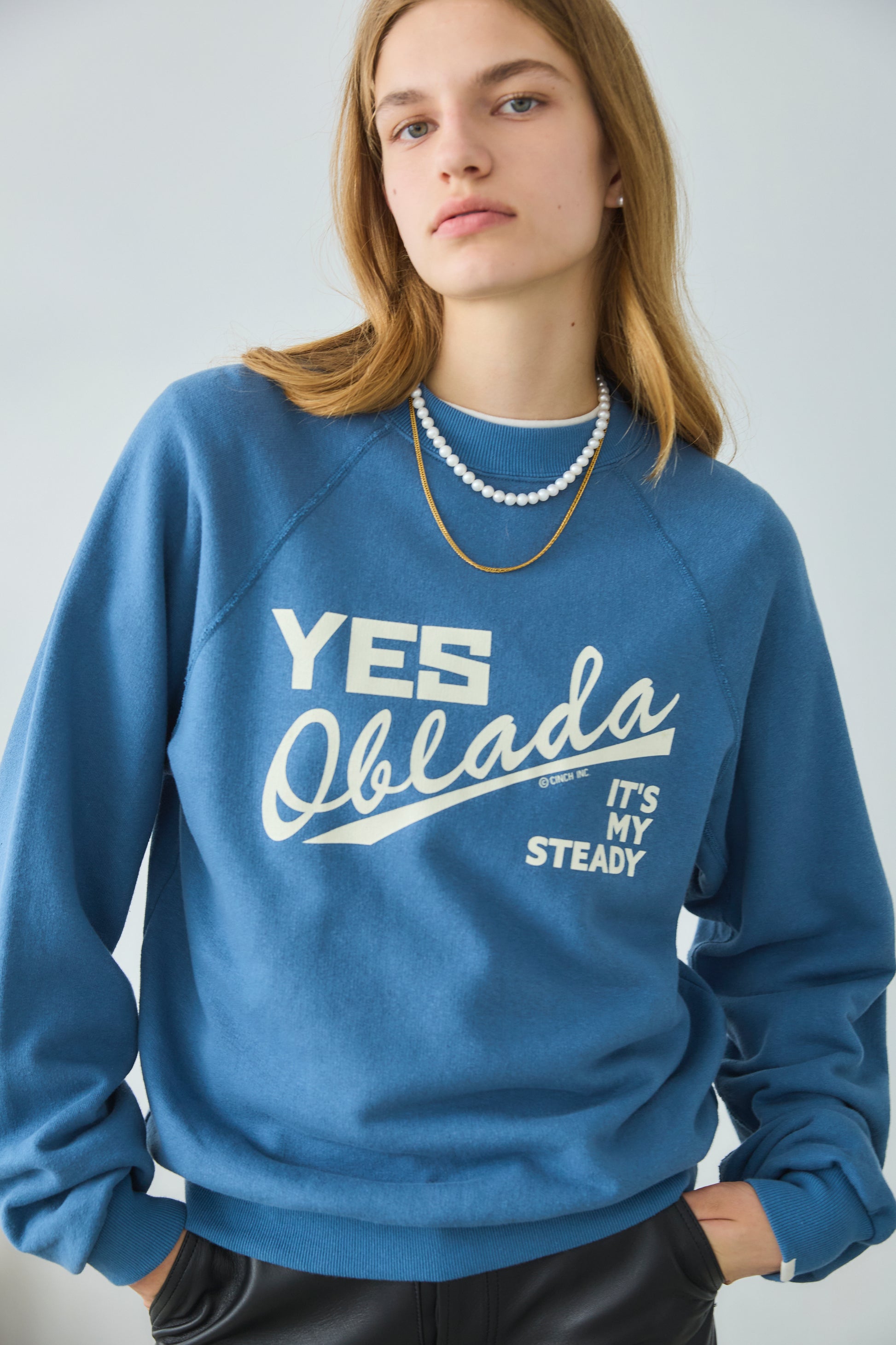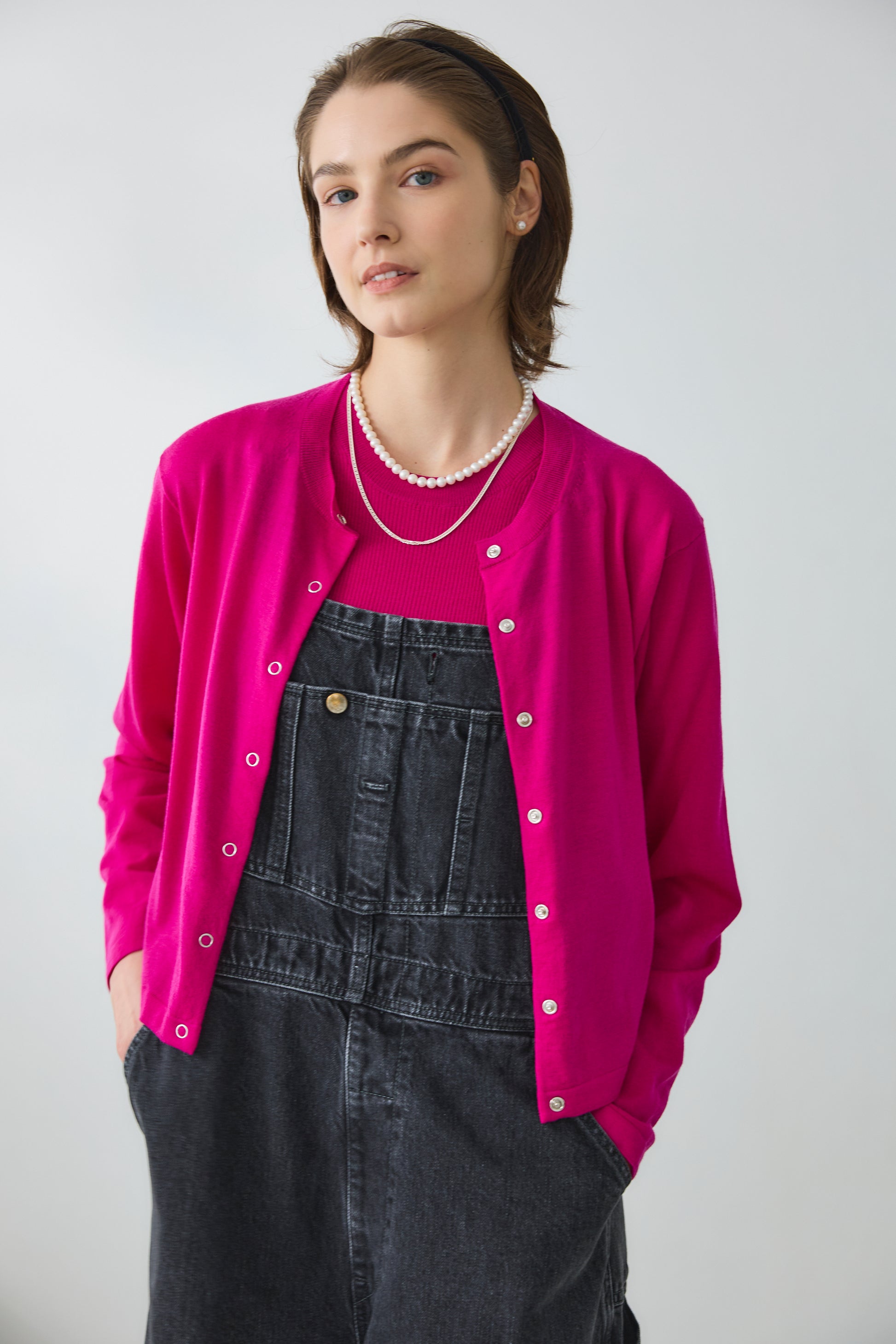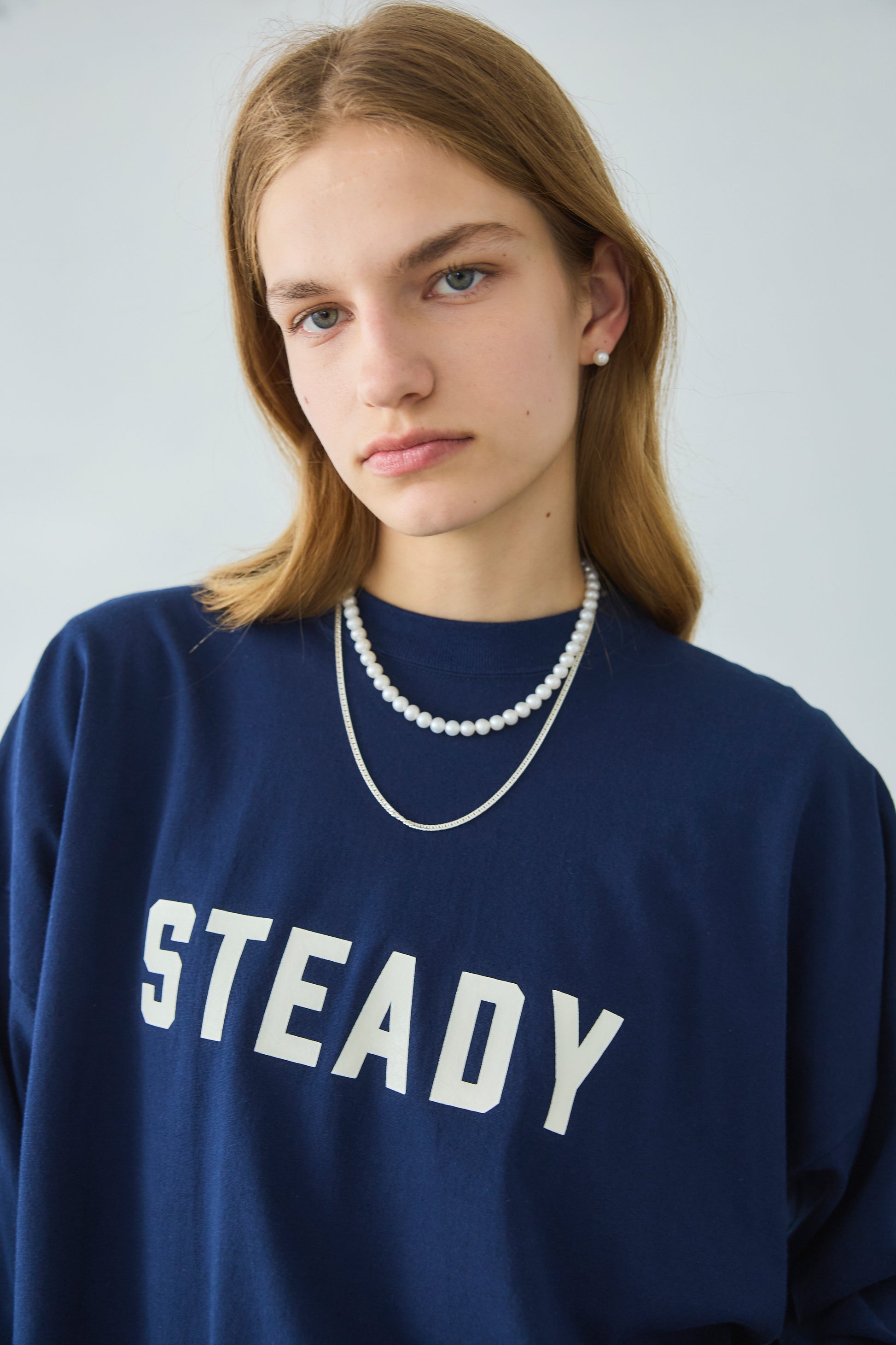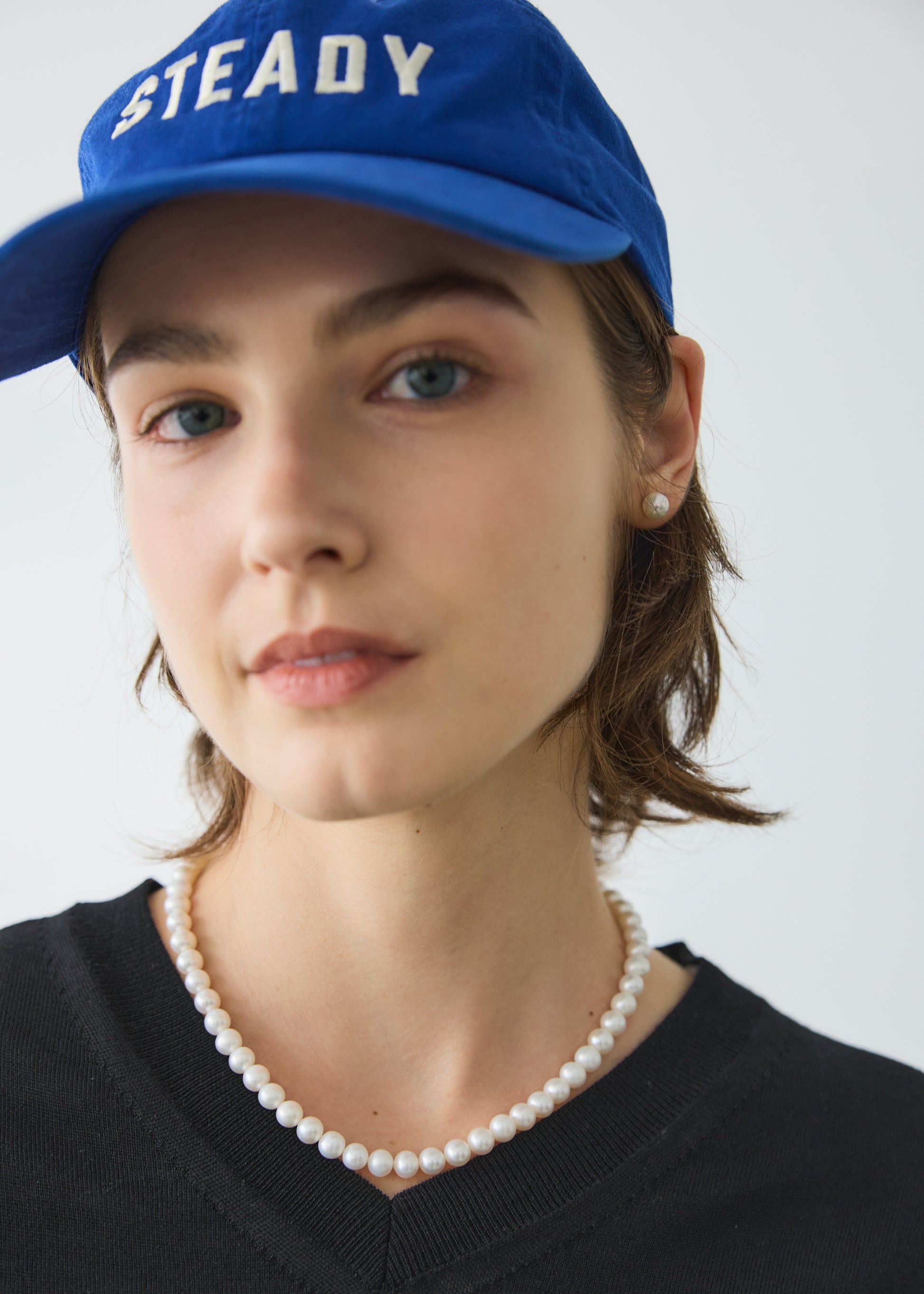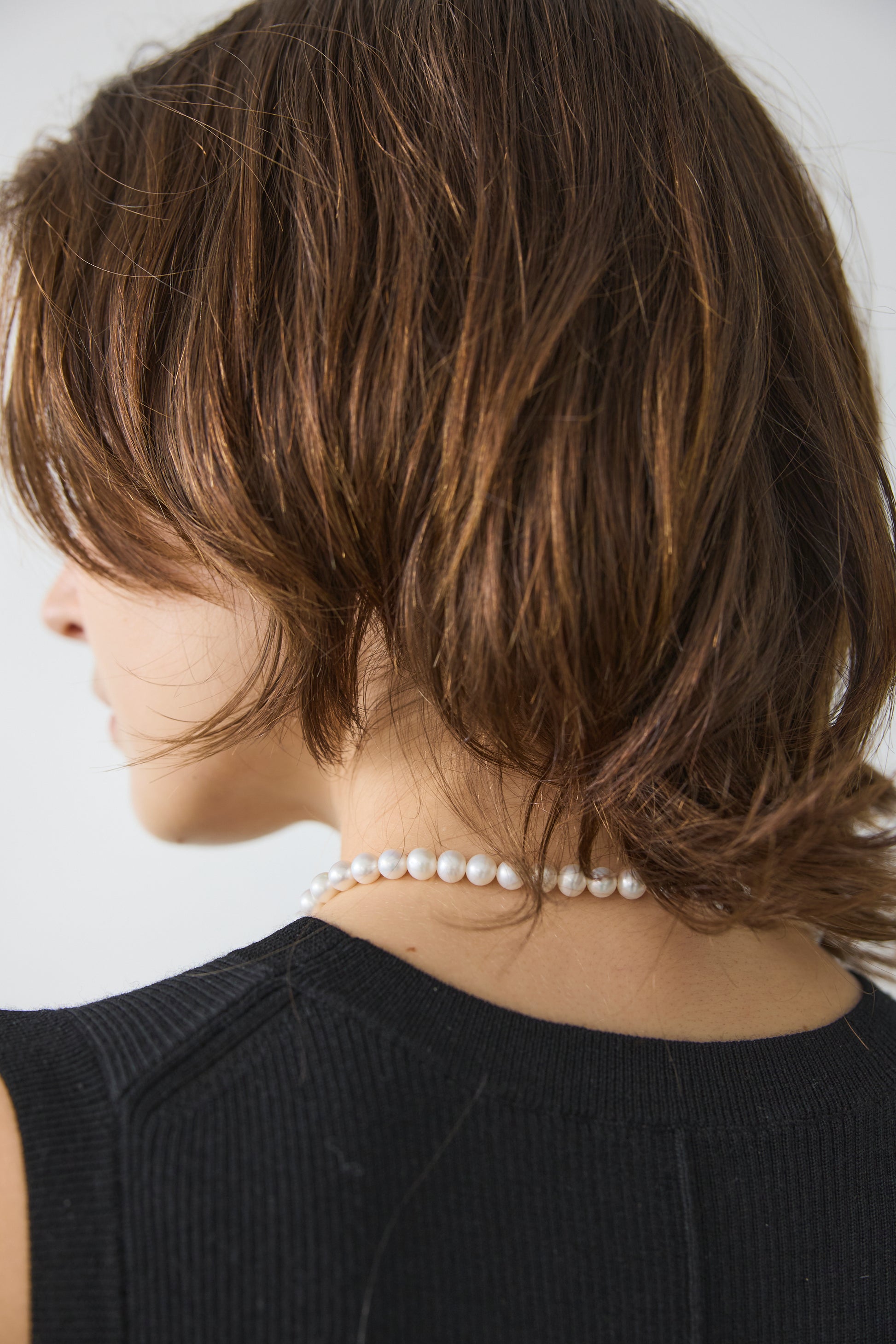 7.5ミリから8ミリの、カジュアルに使いやすいバランスのパール粒を選んで制作しており、カジュアルなスエットにもバッチリ合う長さで作っています。
