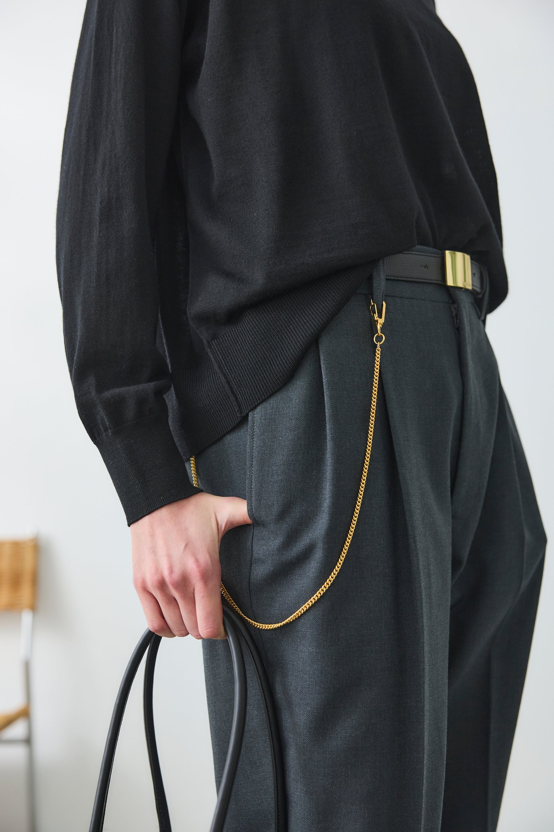 リンキング(はぎめ)をあえて外に出しているので、上品な雰囲気の中にカジュアルさもあります。